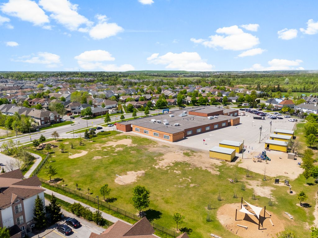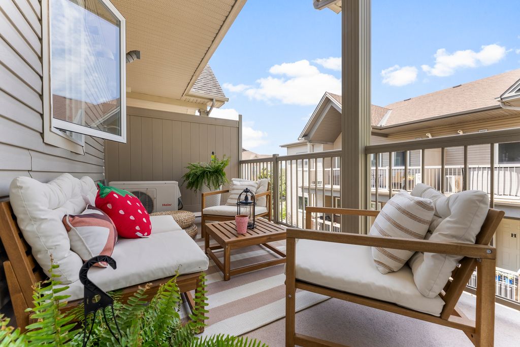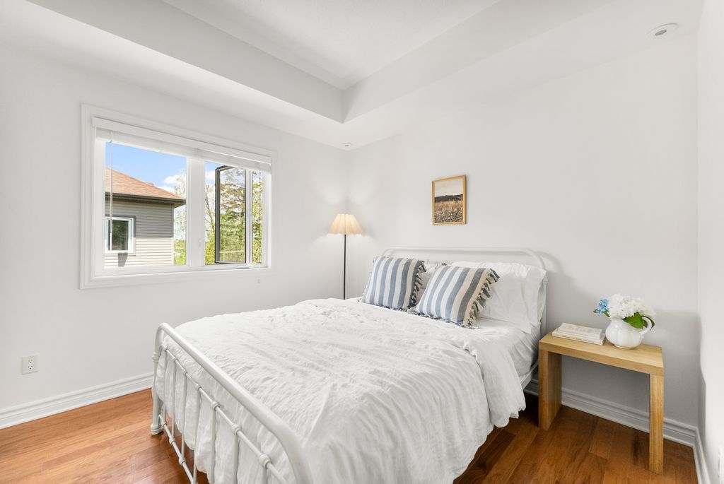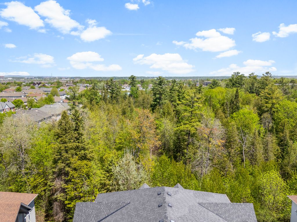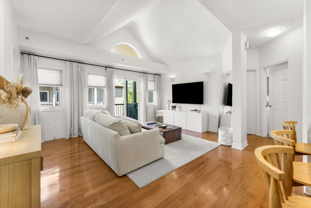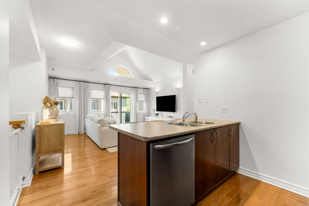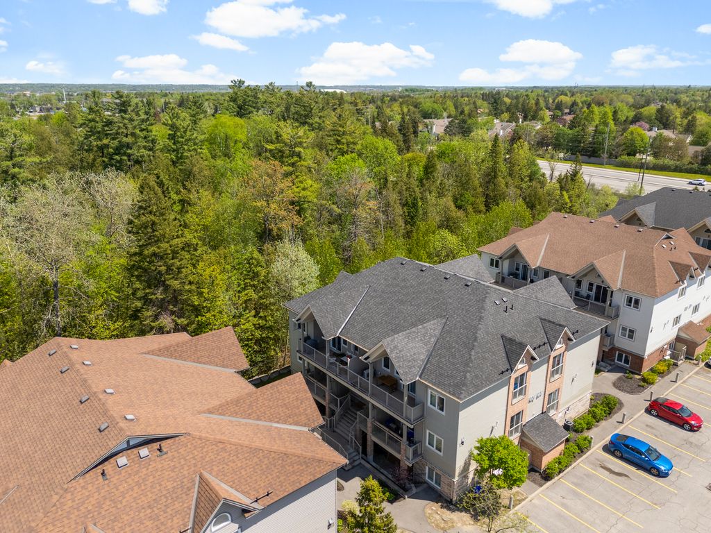 Welcome to carefree condo living in the highly sought-after community of Jackson Trails! This beautifully maintained upper unit is flooded with natural light thanks to its abundance of windows and soaring vaulted ceilings. With no rear neighbours and views of the trees, it offers a peaceful retreat just steps from all the amenities you need. The open-concept living and dining area features a full wall of windows, creating an airy, sun-filled space perfect for relaxing or entertaining. Rich hardwood flooring flows throughout the main living areas and both bedrooms, adding warmth and elegance. The kitchen is both stylish and functional, with stainless steel appliances, a sleek glass tile backsplash, a breakfast bar for casual dining, and convenient in-unit laundry access. The primary bedroom is a serene escape with a generous walk-in closet and a patio door that opens to tranquil treetop views, no rear neighbours to disturb your privacy. The second bedroom is also a great size, making it ideal for guests, a home office, or a cozy retreat. The large main bathroom offers both comfort and style, featuring a separate soaker tub and a walk-in shower. Off the living room, step out onto your private balcony, the perfect spot for morning coffee or evening unwinding. Located just minutes from shopping, restaurants, banking, schools, and transit, this home offers the best of both comfort and convenience. Whether you're a first-time buyer, downsizer, or investor, this bright and spacious unit checks all the boxes. Don't miss this opportunity to own in one of Stittsville's most popular neighbourhoods!