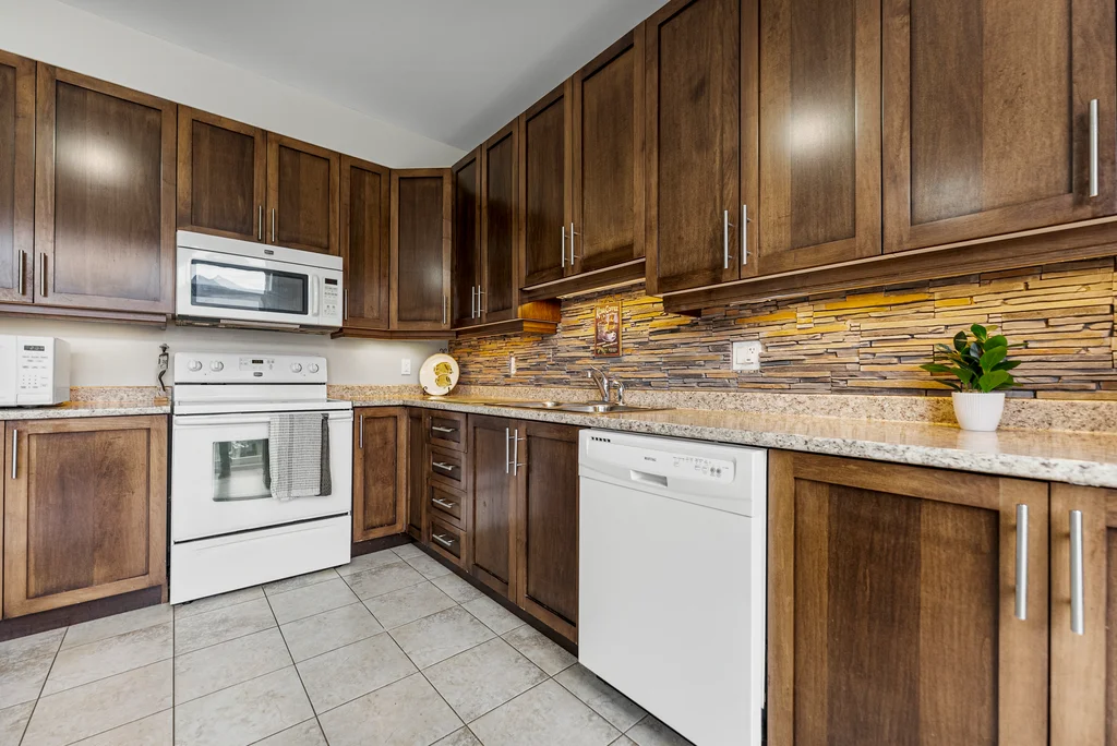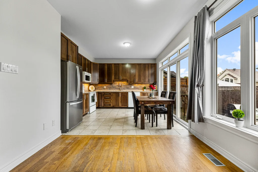 windows that fill the space with natural light. The kitchen includes a convenient eat-in dining area with direct access to the backyard that flows